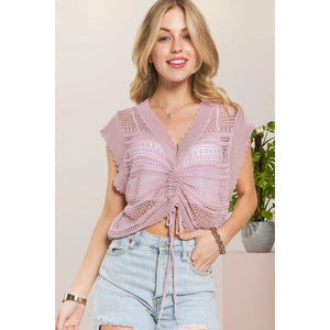 The drawstring detail crochet top combines bohemian charm with practicality. The intricate crochet pattern adds a touch of elegance, while the drawstring detail allows for a customized fit. This versatile top can be paired with denim shorts for a casual daytime look or dressed up with a flowy skirt for a more romantic ensemble. Embrace your inner free spirit with the drawstring detail crochet top, perfect for adding a whimsical touch to your outfit.