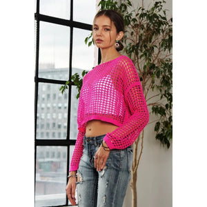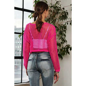 The Drop Shoulder Crochet Crop Top is a trendy and stylish piece for your wardrobe. Featuring a chic crochet design, this crop top adds a boho touch to your outfit. The drop shoulder style gives it a relaxed and laid-back vibe. Perfect for pairing with high-waisted jeans or skirts for a fashionable look. A must-have for those looking to add a touch of texture and flair to their outfit.