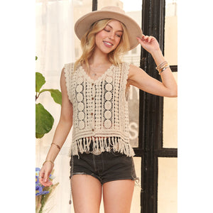 The Fringe Hem Crochet Vest Cardigan is a boho-chic and versatile layering piece that adds a touch of bohemian flair to your outfit. The crochet construction gives it a light and airy feel, perfect for layering over tops and dresses during warmer weather. The fringe hem adds a playful and free-spirited touch, lending a bohemian vibe to your look. This crochet vest cardigan can be styled with a variety of outfits, such as jeans, shorts, or maxi dresses, for a trendy and effortless ensemble that exudes a relaxed and stylish aesthetic.