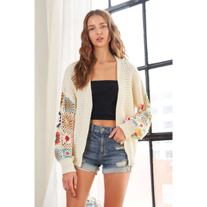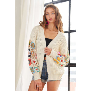 ADORA Full Size Contrast Crochet Open Front Long Sleeve Cardigan