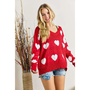 This V-neck knit top features a charming heart design for a sweet and romantic touch. The heart motif creates a lovely and playful detail that adds a touch of whimsy to the classic V-neck silhouette. Made with soft and cozy knit fabric, this top offers both comfort and style for everyday wear. Elevate your wardrobe with this adorable and versatile piece that effortlessly combines comfort and a touch of love-inspired flair. Perfect for adding a fun and feminine element to your outfit.