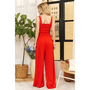 The Smocking Top Wide Leg Jumpsuit combines style and comfort effortlessly. The smocked top provides a fitted and flattering look, while the wide-leg design offers a chic and relaxed silhouette. This jumpsuit is a versatile choice for any occasion, whether it's a casual day out or a special event. Effortlessly stylish and easy to wear, this jumpsuit is a must-have in any wardrobe.