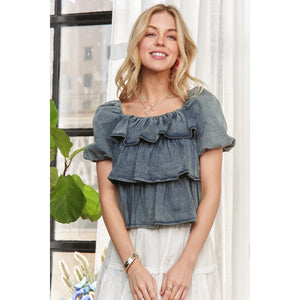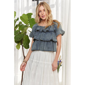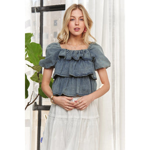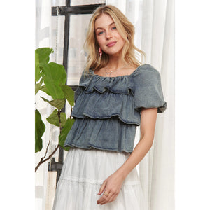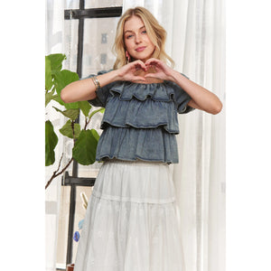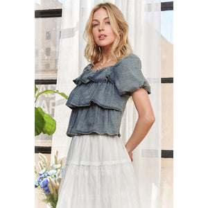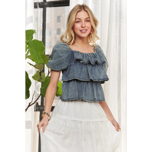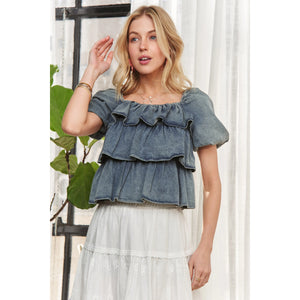 ADORA Washed Denim Layered Ruffle Blouse