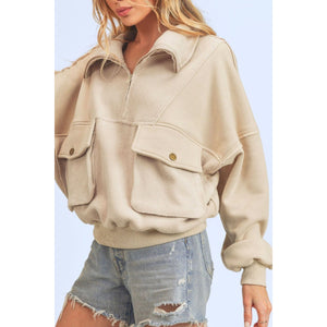The Exposed Seam Half Zip Sweatshirt with Pockets is a trendy and practical choice for casual wear. Featuring exposed seams for added visual interest and a touch of uniqueness. The half-zip design offers versatility in styling and easy wearing. Complete with pockets for added functionality and a laid-back vibe.