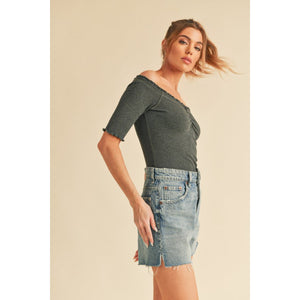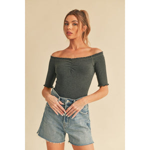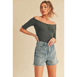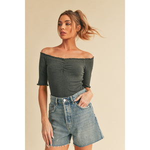 Aemi + Co Ruched Frill Off-Shoulder Half Sleeve Knit Top