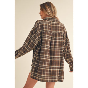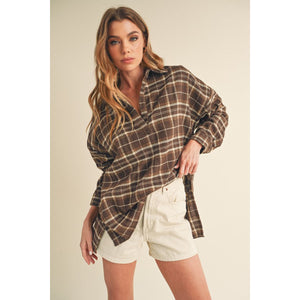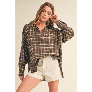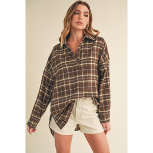 Aemi + Co Side Slit High-Low Plaid Long Sleeve Polo Shirt