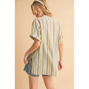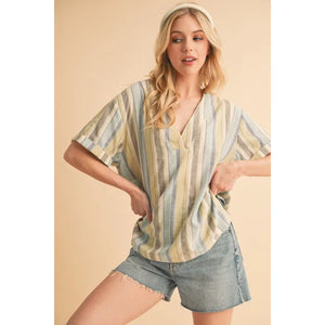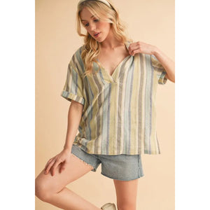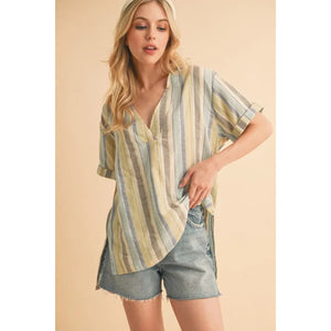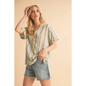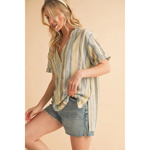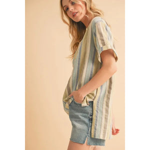 Aemi+Co Side Slit Striped Short Sleeve Blouse