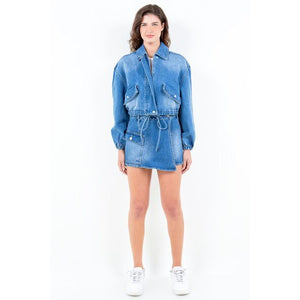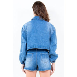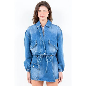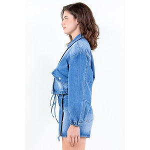 American Bazi Full Size Drop Shoulder Cropped Denim Jacket with Waist Strap Plus Size