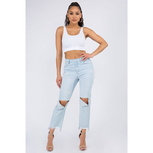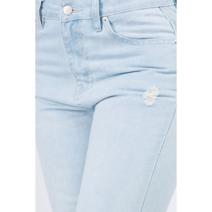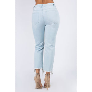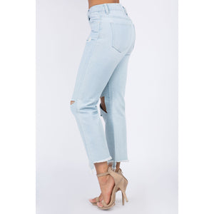 The High Waist Distressed Raw Hem Jeans are a stylish and edgy wardrobe staple that combines fashion with comfort. Featuring a high waist design, these jeans offer a flattering silhouette that accentuates your curves. The distressed detailing adds a trendy and casual vibe to the look, perfect for creating a cool and laid-back outfit. With raw hem finishes, these jeans exude a modern and urban aesthetic that is perfect for casual occasions. Whether you're running errands or meeting friends for a weekend brunch, these jeans are a versatile and on-trend choice. Elevate your denim game with the High Waist Distressed Raw Hem Jeans, a must-have piece for adding a touch of edge to your everyday style.