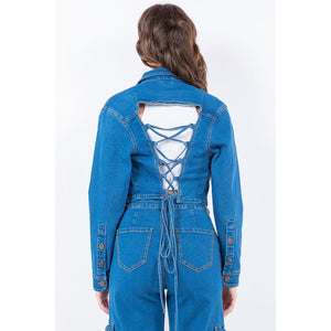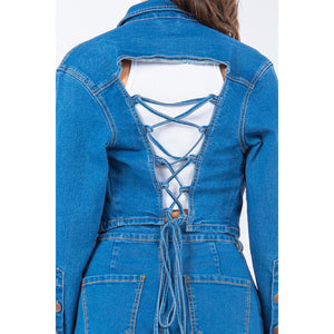 A denim laced back cropped jacket features a button front closure, cropped length, and laced back trims. This stylish piece offers a unique twist on the classic denim jacket silhouette, adding a touch of modern flair to your outfit. The button front closure provides a secure fit, while the cropped length offers a trendy and versatile look. The laced back trims add a playful and eye-catching detail, perfect for those looking to make a fashion statement. Whether paired with jeans for a casual day out or layered over a dress for a night out, this jacket is sure to elevate your style effortlessly. Add a denim laced back cropped jacket to your wardrobe for a chic and on-trend piece that you'll love to wear.
