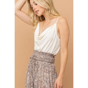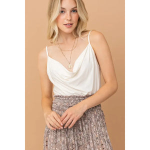 The cowl neck cami is a versatile and stylish piece that can elevate any outfit. The cowl neckline adds a touch of sophistication and drapes elegantly, making it a flattering choice for any body type. This cami can be easily dressed up with a blazer and trousers for a professional look, or paired with jeans and heels for a more casual yet chic ensemble. Whether worn alone or layered under a cardigan, the cowl neck cami is a timeless and versatile staple for any wardrobe.