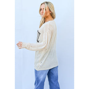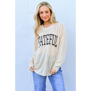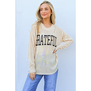 The "GRATEFUL" long sleeve knit top is a trendy and stylish choice for the upcoming season. Its comfortable fabric and flattering fit make it a versatile piece for your wardrobe. With its chic design and cozy feel, this top is perfect for layering or wearing on its own. The "GRATEFUL" top is sure to keep you looking fashionable and feeling great all day long. Add this must-have item to your collection and elevate your everyday style effortlessly. Embrace comfort and fashion with the "GRATEFUL" long sleeve knit top.