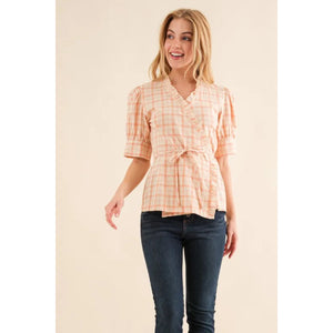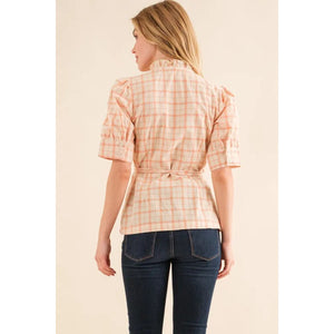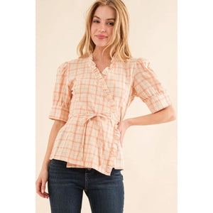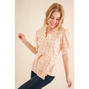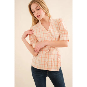 And The Why Plaid Patterned and Ruffled Wrap Blouse Top