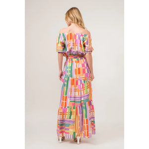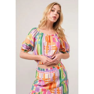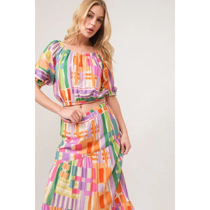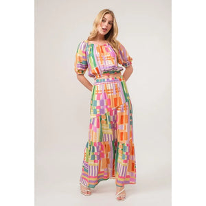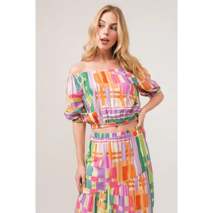 And The Why Puff Sleeve Elastic Edges Geo Printed Crop Top