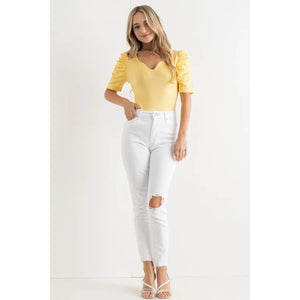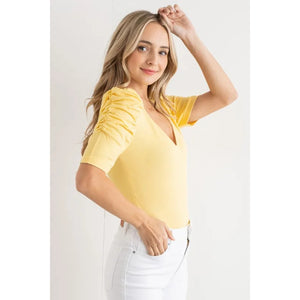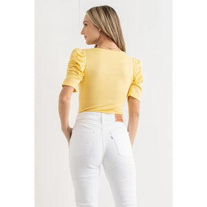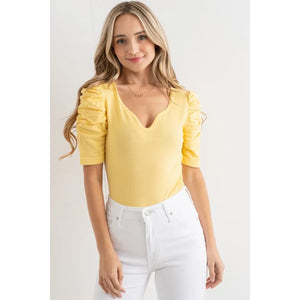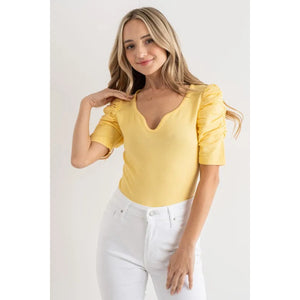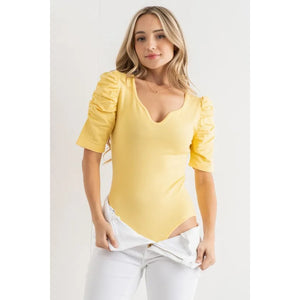 The Basic Shirring Puff Sleeve Bodysuit is a versatile and stylish piece for your wardrobe. The shirring detail adds a flattering fit, while the puff sleeves bring a touch of femininity and charm. This bodysuit is perfect for pairing with high-waisted bottoms for a chic and effortless look.