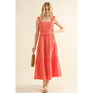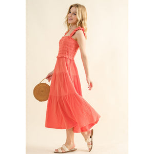 The Smocked Ruffled Tiered Dress is a charming and feminine piece that exudes effortless style. The smocked bodice provides a comfortable and flattering fit, while the ruffled tiers add a playful and flirty touch to the design. This dress is perfect for a sunny day out or a casual event. The flowy silhouette and lightweight fabric make it a comfortable and breezy option for warm weather. Pair it with sandals and a sunhat for a relaxed and chic look. Elevate your summer wardrobe with the delightful charm of the Smocked Ruffled Tiered Dress.