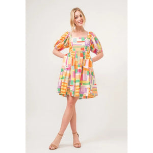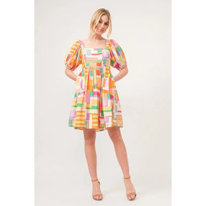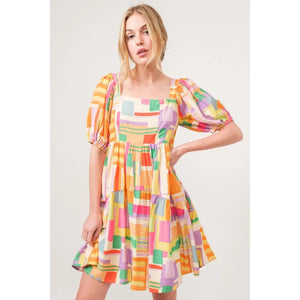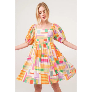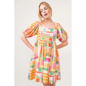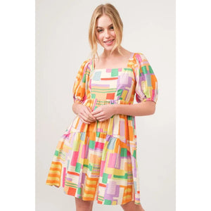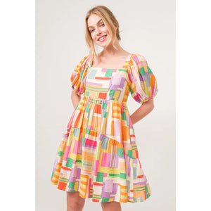 And The Why Square Neck Puff Sleeve Geo Printed Mini Dress