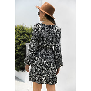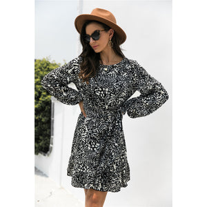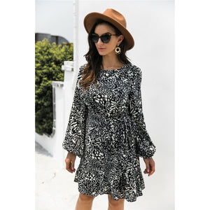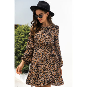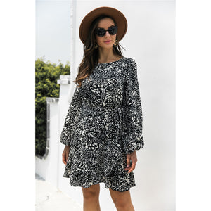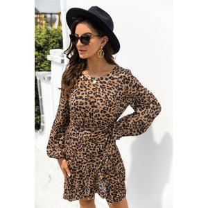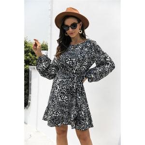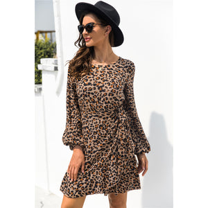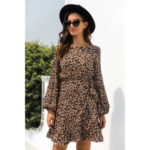 Animal Print Round Neck Balloon Sleeve Mini Dress