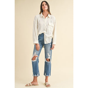 Distressed raw hem cropped jeans are a fashionable and edgy choice for a stylish and casual outfit. The distressed detailing gives the jeans a worn-in and vintage look, adding a touch of cool and relaxed vibe to your ensemble. The raw hem, with its unfinished and frayed edges, adds a trendy and modern appeal to the cropped length of the jeans, making them a versatile piece for various occasions. These jeans can be styled with sneakers and a graphic tee for a laid-back street style look, or dressed up with heels and a blouse for a more chic and fashion-forward outfit.