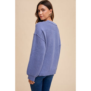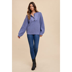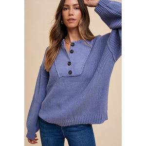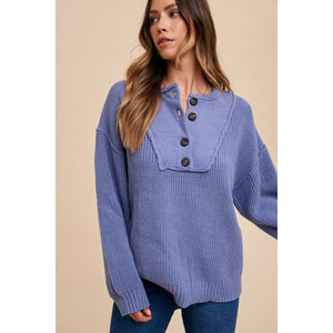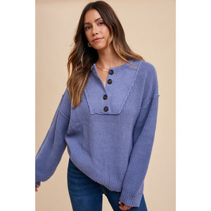 Annie Wear Half Button Ribbed Hem Sweater