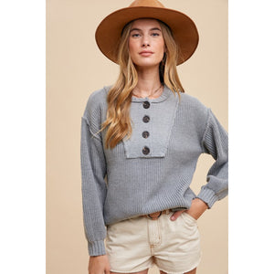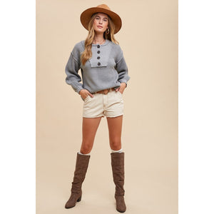 Annie Wear Half Button Ribbed Hem Sweater
