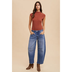 Mid-rise barrel leg jeans with pockets are a stylish and versatile choice for adding a retro-inspired element to your wardrobe. The mid-rise fit sits comfortably at the natural waist and offers a flattering silhouette that is both modern and timeless. The barrel leg style features a wider, relaxed fit from the hip to the leg opening, giving a nod to vintage denim trends.