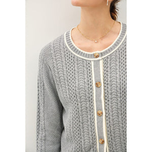 This chunky cable knit cardigan is a cozy and stylish choice for fall and winter layering. It features a classic button-down style with tortoise buttons and a round neck. The long sleeves add warmth, while the chunky cable knit design provides texture and visual interest. The accent color around the edges adds a pop of color for a playful touch. Overall, this cardigan exudes a preppy, elegant, and cute aesthetic, making it easy to wear for everyday outfits.