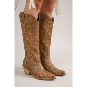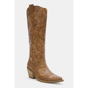 Beast Fashion Embossed Floral Point Toe Block Heel Boots
