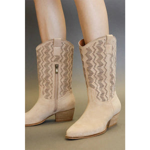 Beast Fashion Faux Suede Laser Cut Detail Block Heel Boots