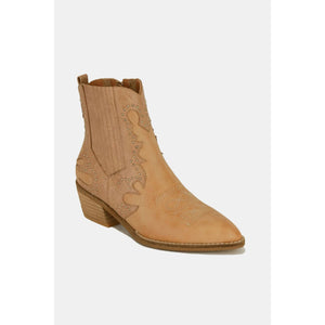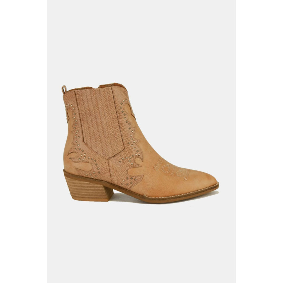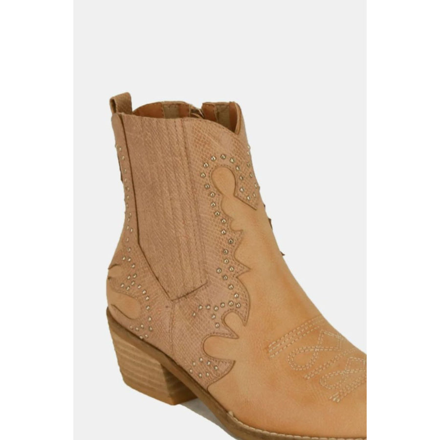 Studded detail point toe boots are a stylish and edgy footwear option that features embellished studs on the upper part of the boots. These boots offer a bold and statement-making look, adding a touch of attitude and personality to your outfit. The point toe silhouette adds a sleek and fashionable touch to the boots, creating a contemporary and chic aesthetic. Perfect for adding a rock 'n' roll vibe to your ensemble, these boots can be paired with a variety of outfits, from jeans and a leather jacket to dresses for a more unexpected and unique style. The studded detail adds a touch of edge and interest, making these boots a standout piece in your wardrobe.