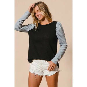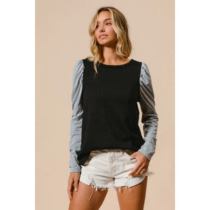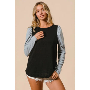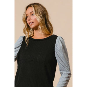 BiBi Cable Sweater Knit Top with Contrast Puff Sleeve