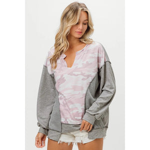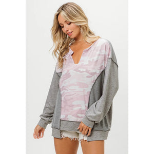 The Camo Printed French Terry Knit Color Block Top combines a trendy camo print with a color block design in soft French terry knit fabric. This top offers a stylish and casual look with a mix of patterns and textures. Perfect for adding a touch of edgy flair to your outfit while staying comfortable and on-trend.
