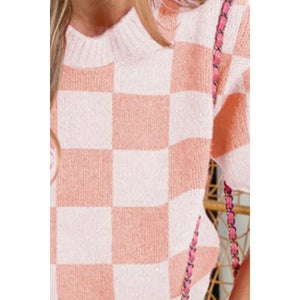 BiBi Check Pattern Short Puff Sleeve Sweater Top