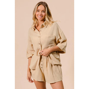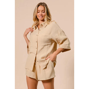 The Crinkle Gauze Shirt and Short Set is a fashionable and comfortable ensemble featuring a shirt and matching shorts made from lightweight crinkle gauze fabric. This coordinating set offers a breezy and casual style perfect for warm weather days or relaxed outings. The crinkle texture adds a laid-back vibe to the outfit while keeping you cool and stylish.
