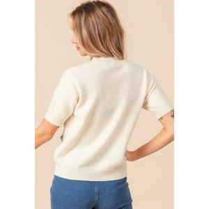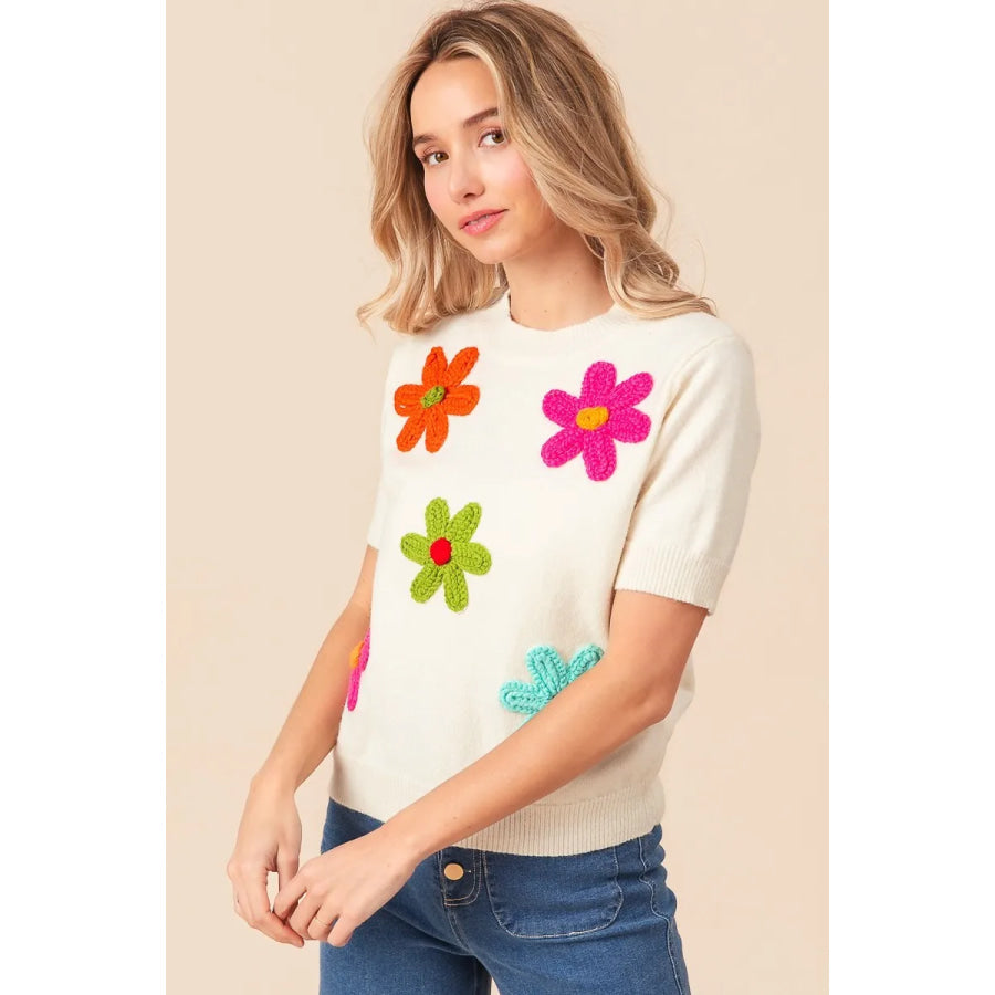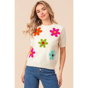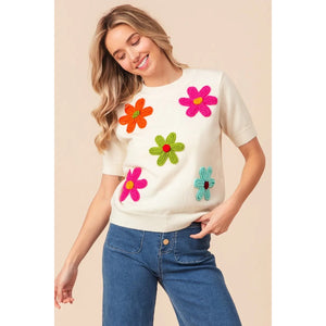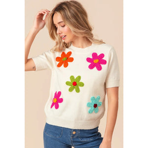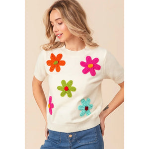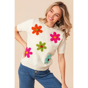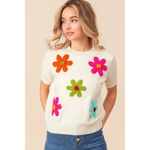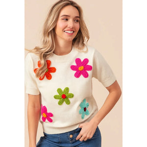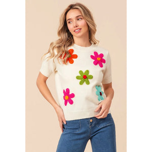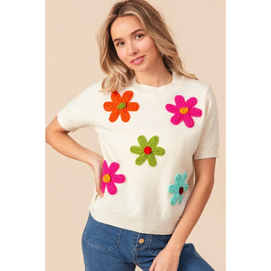 This charming pullover sweater features a delightful collection of embroidered daisy flowers in vibrant colors including hot pink, orange, green, and turquoise. Crafted from soft knit fabric, this short-sleeve pullover offers comfort and style with its classic crew neck design. The playful floral embellishments create a cheerful, feminine aesthetic perfect for casual wear. The lightweight knit construction makes it ideal for layering or wearing alone during warmer seasons. Easy to care for and versatile enough for various occasions, this pullover combines comfort with whimsical design elements that add personality to any wardrobe.