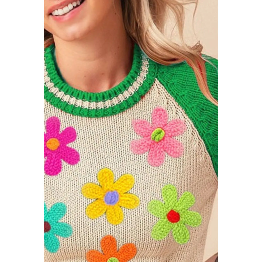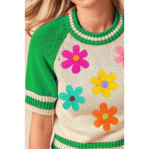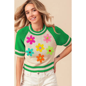 This charming short-sleeve pullover sweater features a delightful combination of vibrant green sleeves and cream-colored body adorned with colorful floral embroidery. Crafted from soft knit material, it showcases playful daisy-like flowers in pink, yellow, orange, and turquoise hues. The ribbed crew neck and cuffs feature classic striped detailing in green and white, adding sporty charm. Perfect for casual spring and summer styling, this pullover offers comfortable wear with its relaxed fit and breathable knit construction. The whimsical floral design makes it an ideal statement piece for adding color and personality to any wardrobe.