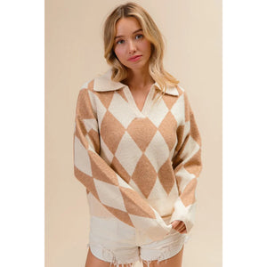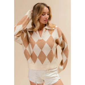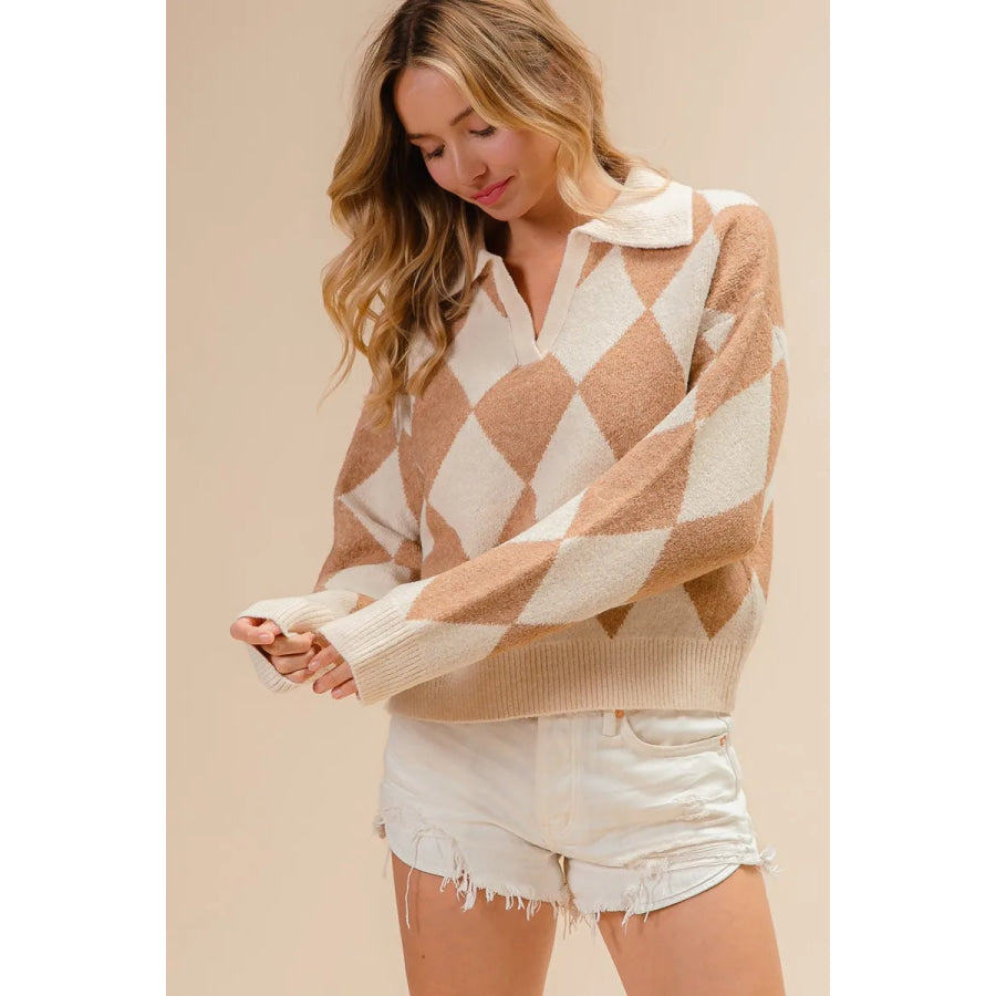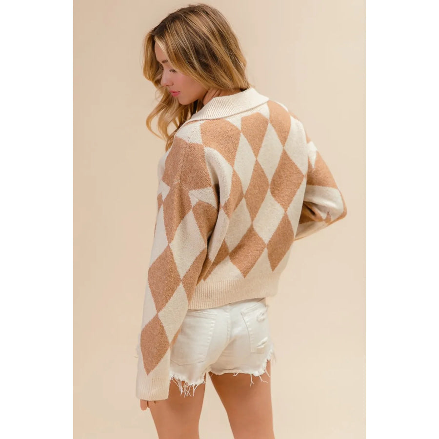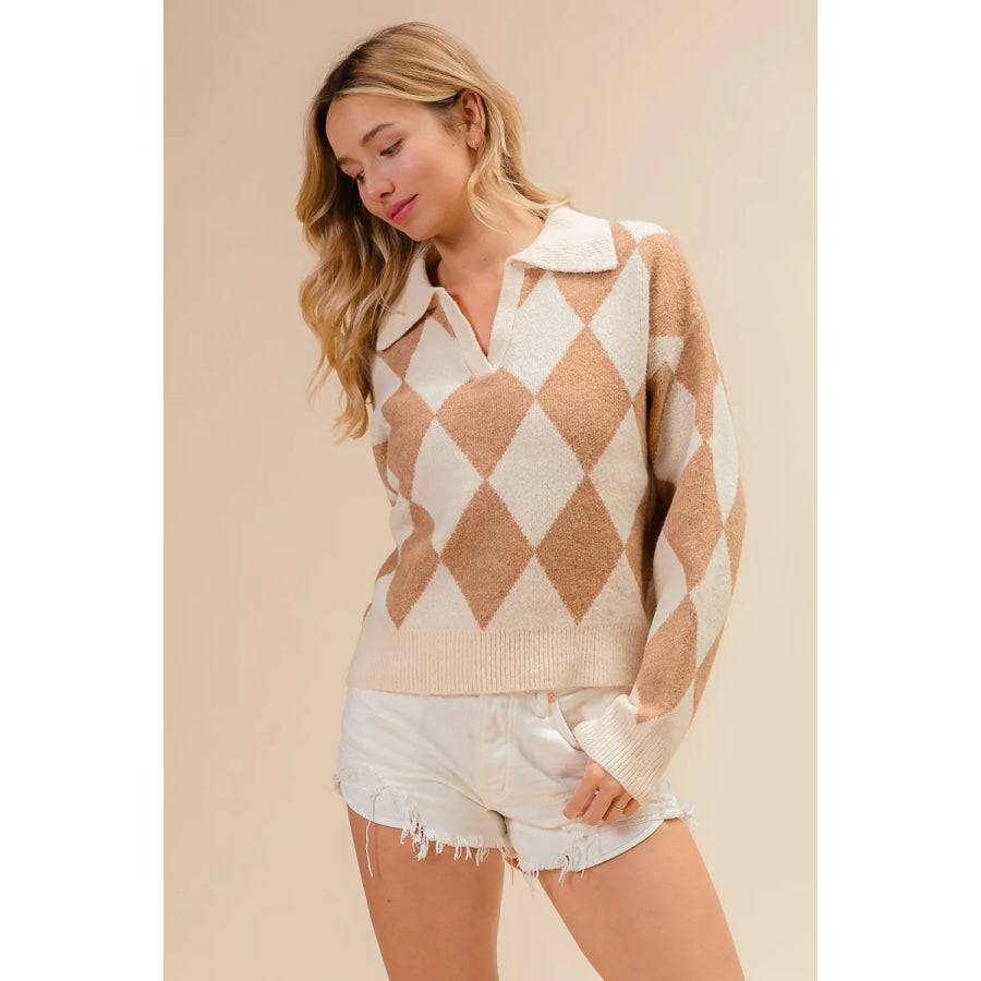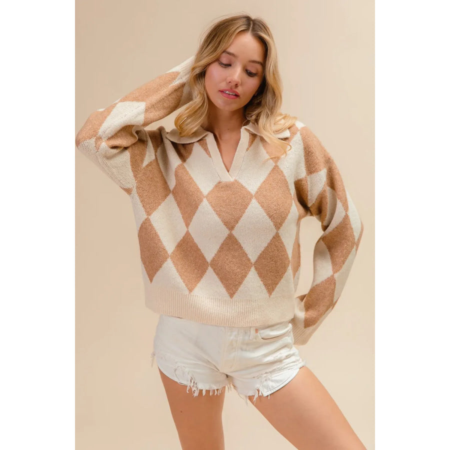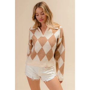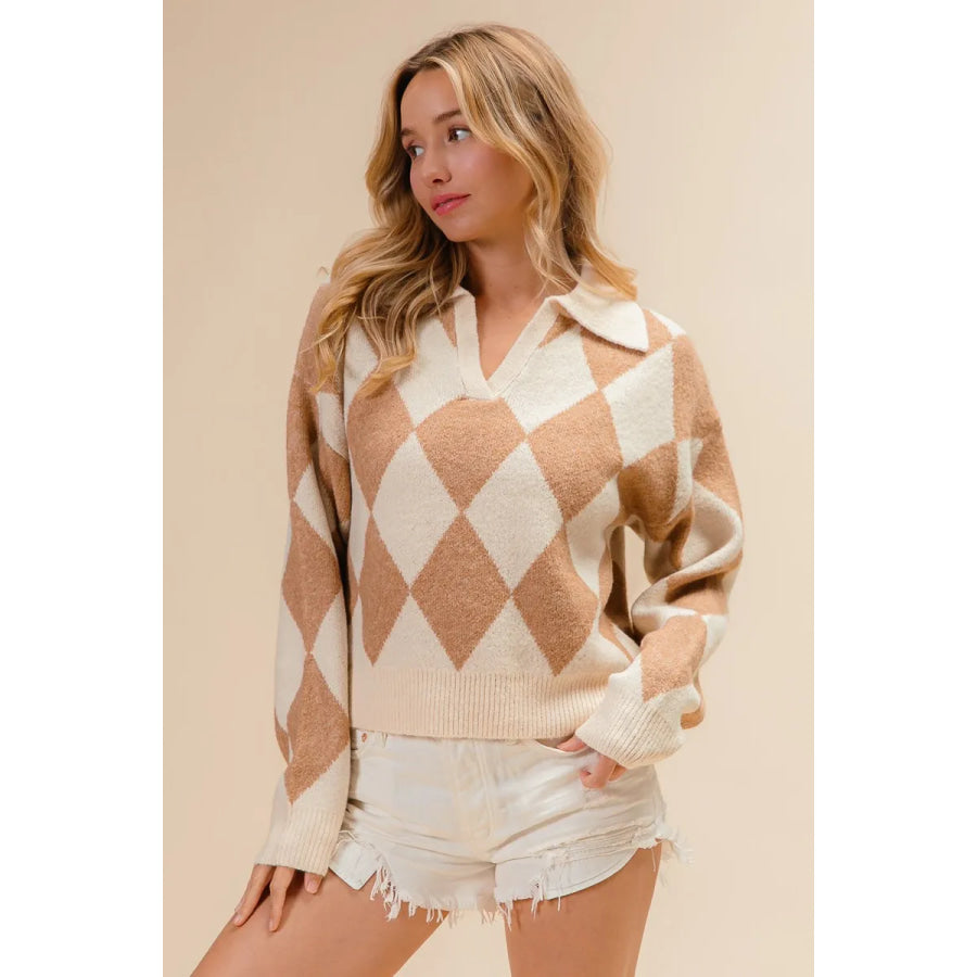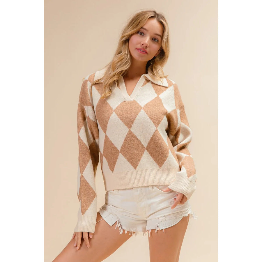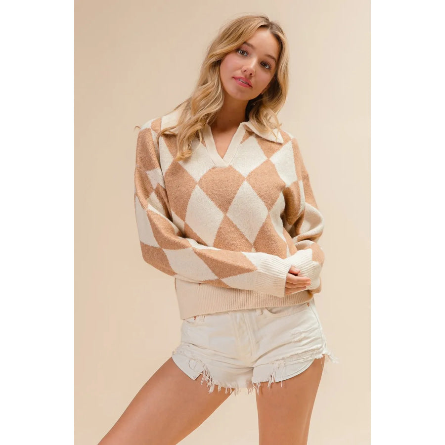 BiBi Diamond Pattern Collared Notch Neck Sweater