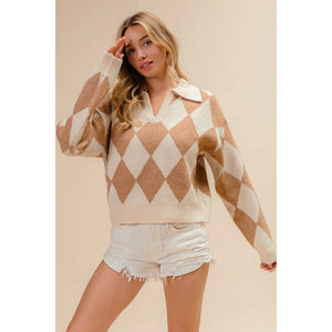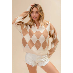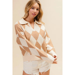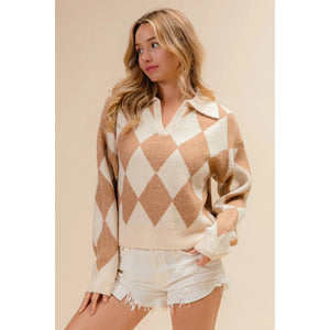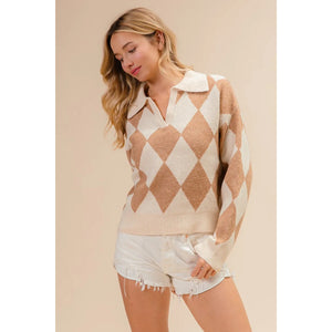 This stylish diamond pattern pullover features a sophisticated argyle design in warm neutral tones of beige and cream. Crafted from soft knit material with a classic polo collar, this versatile sweater offers both comfort and style. The geometric diamond motifs create visual interest while maintaining elegance. Perfect for casual or semi-formal occasions, this pullover pairs beautifully with jeans, shorts, or skirts. The relaxed fit ensures comfortable movement while the ribbed details at cuffs and hem provide structure. Made from quality knit fabric that's easy to care for and maintain its shape after washing.