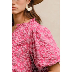 BiBi Floral Pattern Texture Short Balloon Sleeves Ruffled Blouse