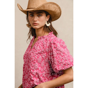 This stunning pink floral blouse features a vibrant all-over botanical print with sophisticated ruffle detailing across the front panel. Crafted from lightweight, breathable fabric with a textured finish, it offers both comfort and style. The short puff sleeves and high neckline create a feminine silhouette perfect for casual outings or western-inspired looks. The eye-catching pink floral pattern makes it a standout piece that pairs beautifully with denim or neutral bottoms. Quality construction ensures durability while maintaining the soft, flowing drape that flatters various body types.