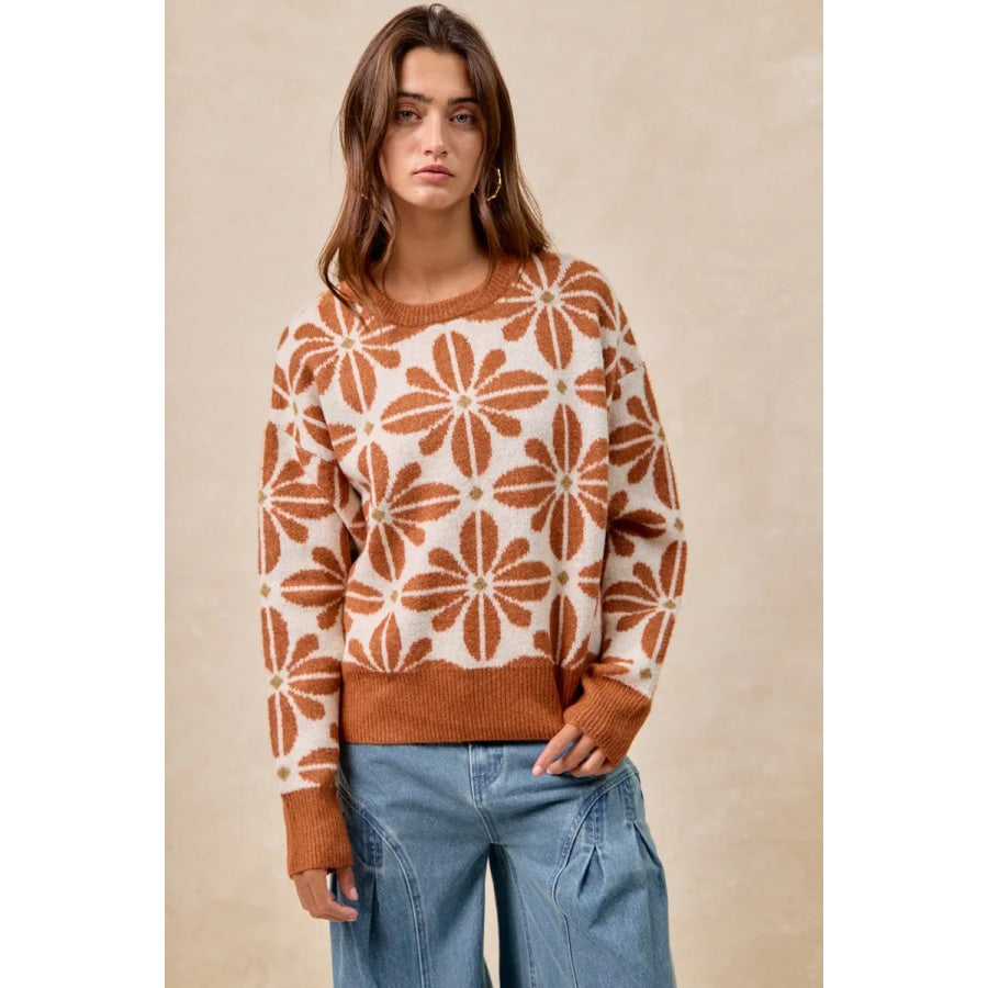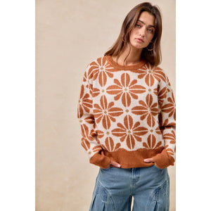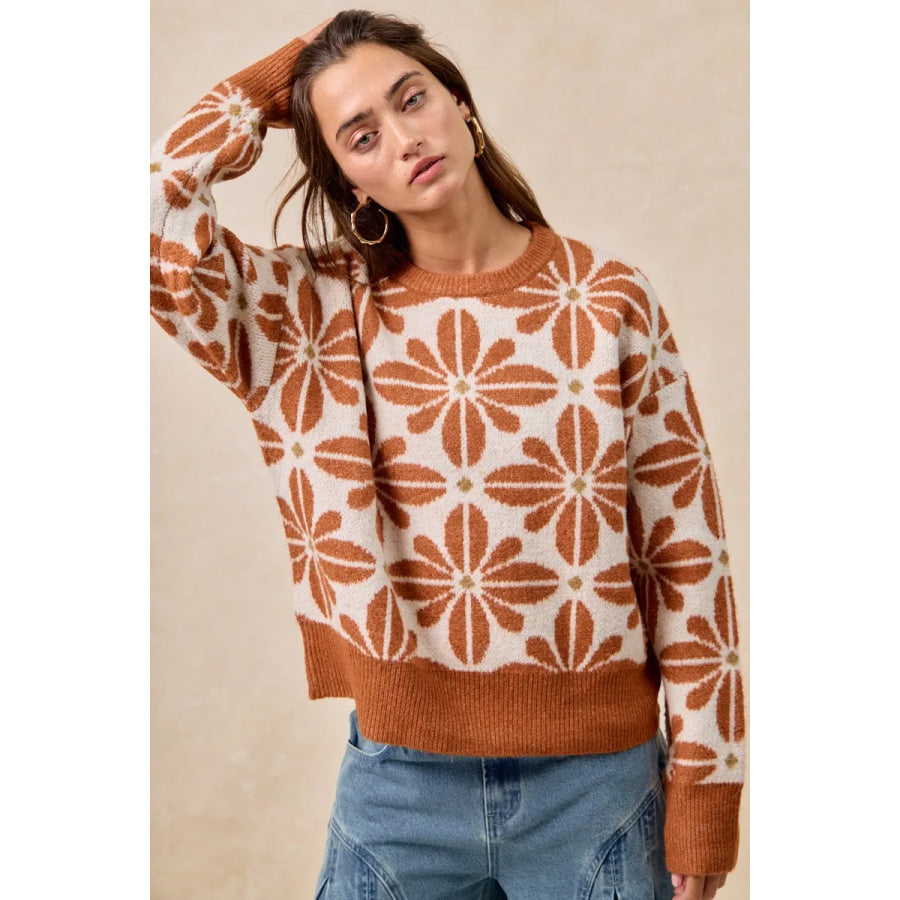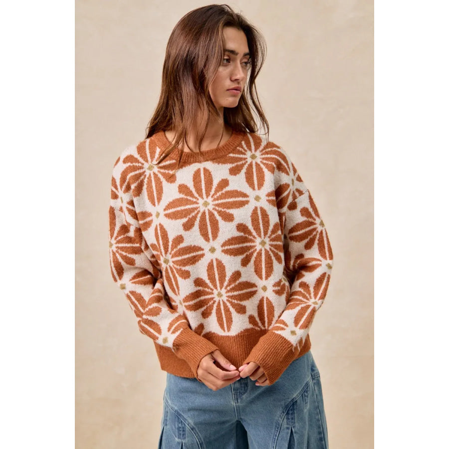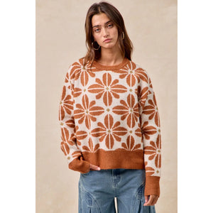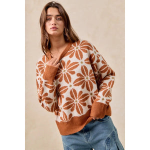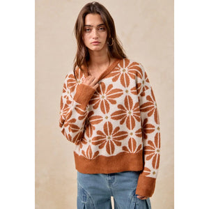 This stylish pullover sweater features a beautiful floral intarsia knit pattern in warm rust and cream tones. Made from soft acrylic blend yarn, it offers exceptional comfort and durability. The classic V-neckline adds sophistication while the relaxed fit provides all-day comfort. Perfect for casual outings, coffee dates, or cozy indoor wear. The ribbed hem and cuffs ensure shape retention, while the eye-catching botanical design makes it a standout piece for fall and winter wardrobes.