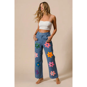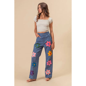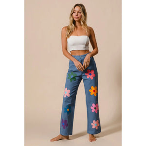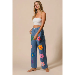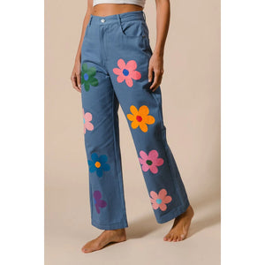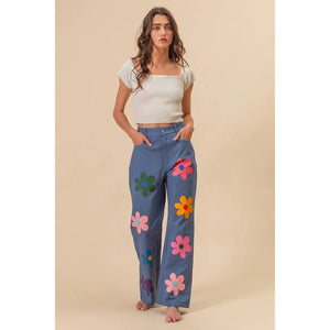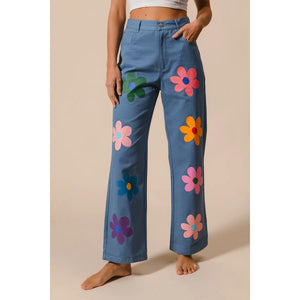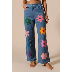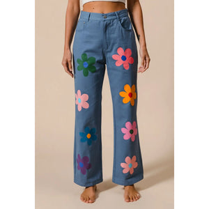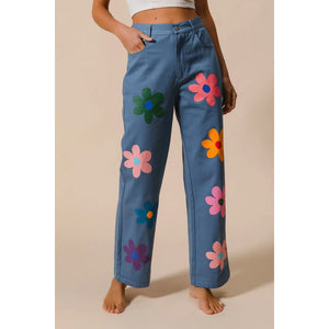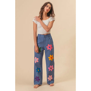 These straight-leg pants feature a vibrant flower print for a chic and stylish look. The bold floral pattern adds a touch of flair to any outfit. With a flattering fit and versatile design, these pants are perfect for both casual and more dressy occasions, making them a versatile and stylish addition to your wardrobe.