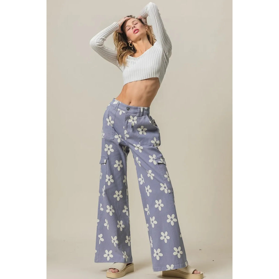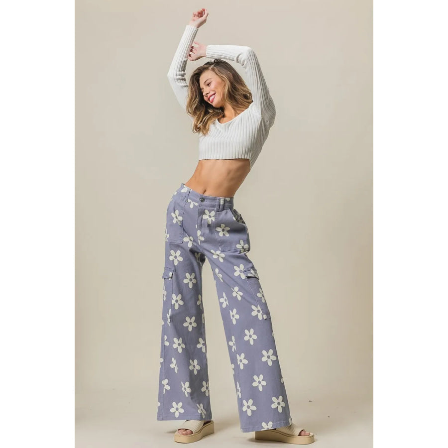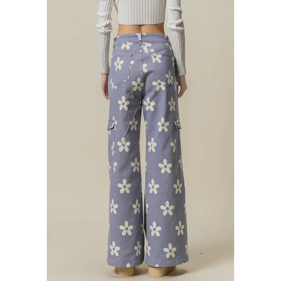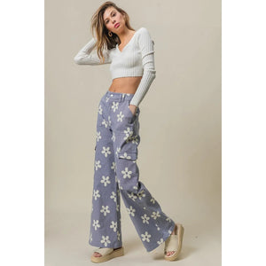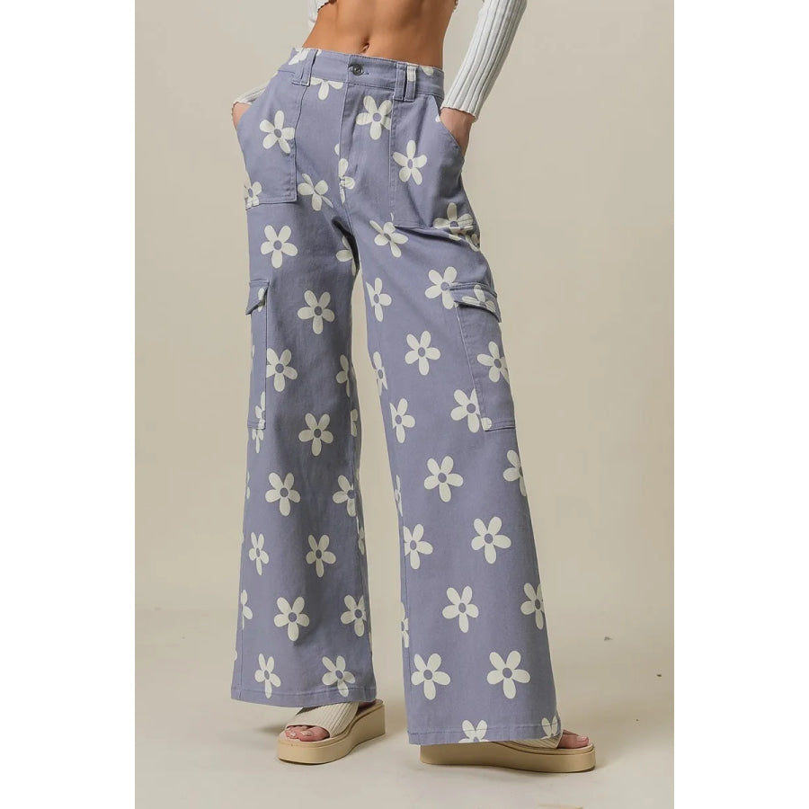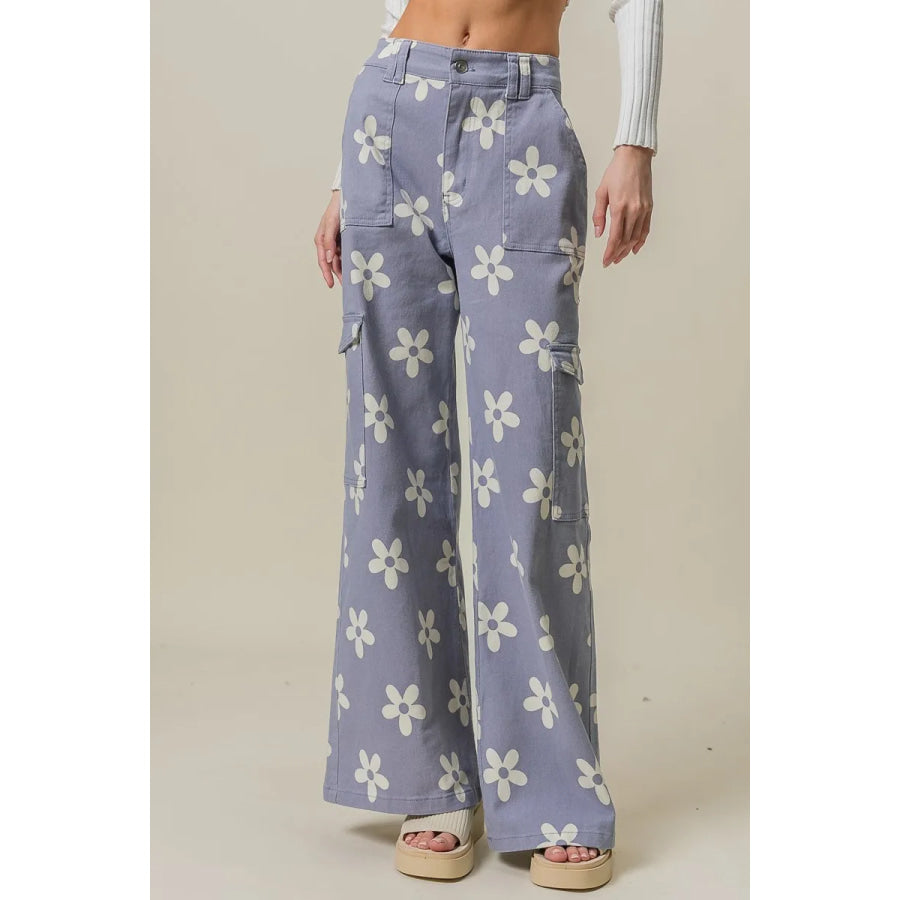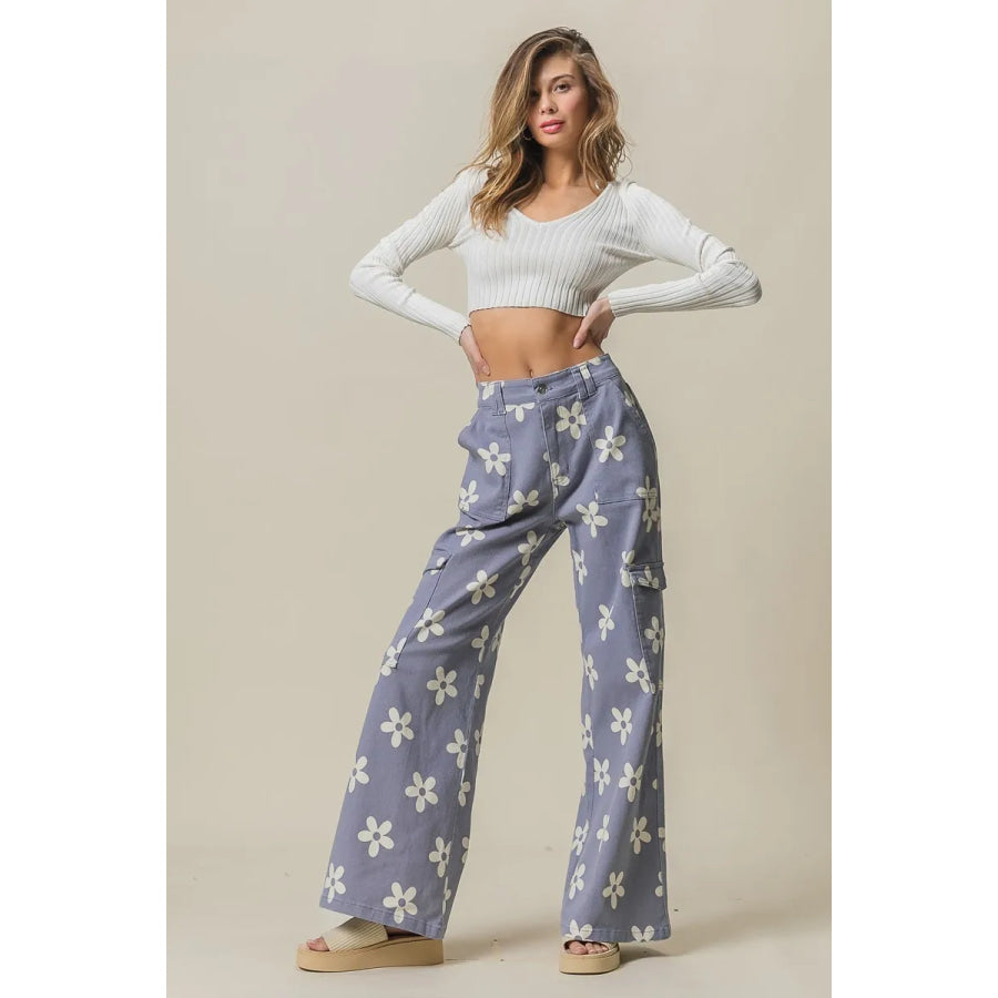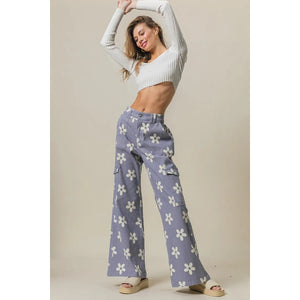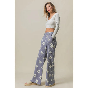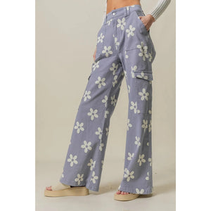 These wide pants feature a charming flower print design and are equipped with convenient side pockets for added functionality. The floral pattern adds a touch of whimsy and femininity to the pants, while the wide-leg silhouette offers a stylish and comfortable fit. Perfect for a casual yet trendy look, these pants can be paired with a simple top or blouse for a fashionable ensemble.