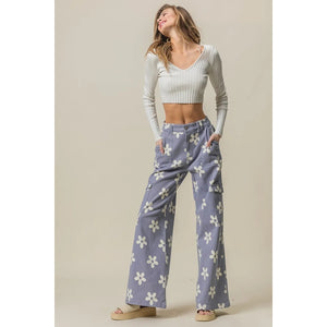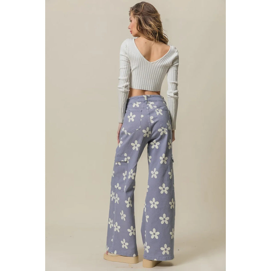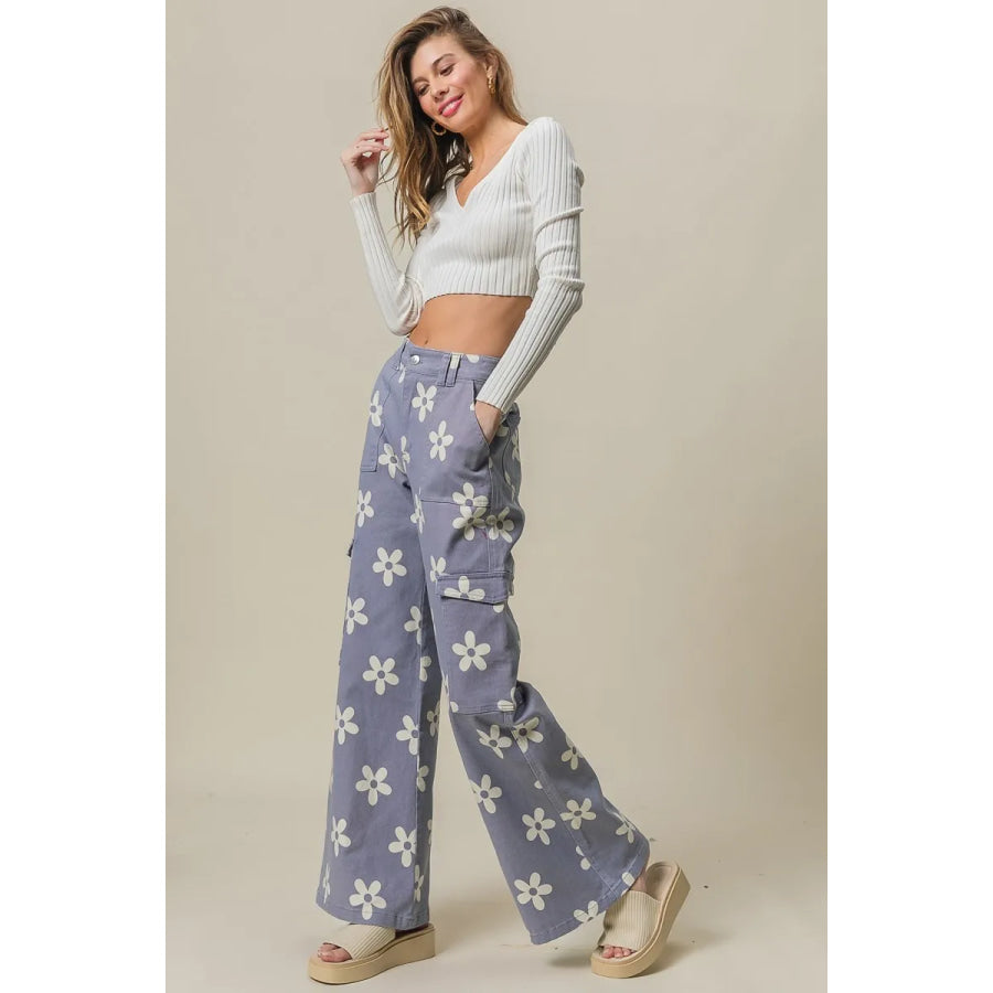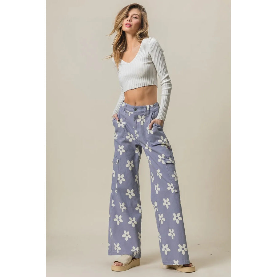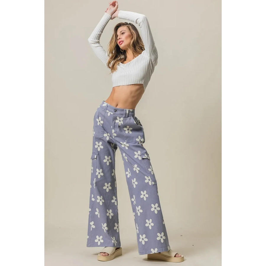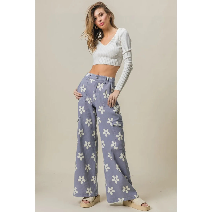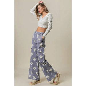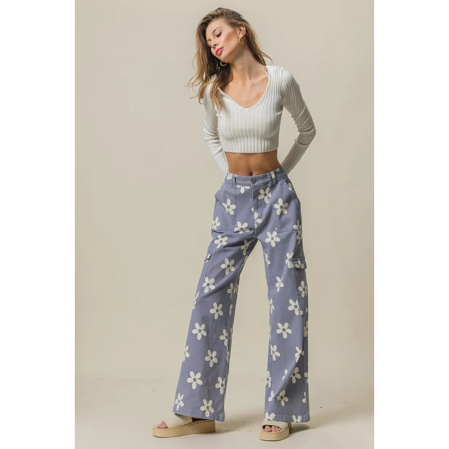 These wide pants feature a charming flower print design and are equipped with convenient side pockets for added functionality. The floral pattern adds a touch of whimsy and femininity to the pants, while the wide-leg silhouette offers a stylish and comfortable fit. Perfect for a casual yet trendy look, these pants can be paired with a simple top or blouse for a fashionable ensemble.