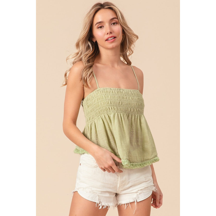 The Fringed Hem Smocked Cami is a trendy and versatile top featuring a flattering smocked bodice and playful fringed hem detail. This cami offers a comfortable and stylish option for creating casual, summery looks. The smocked design provides a fitted silhouette with added stretch for ease of movement. The fringed hem adds a fun and bohemian touch to the overall design. Pair this cami with high-waisted bottoms for a chic and effortless outfit. Enjoy the breezy and fashionable appeal of this Fringed Hem Smocked Cami!