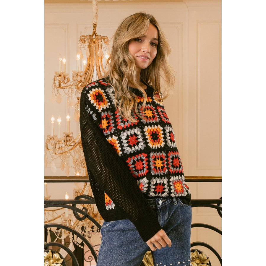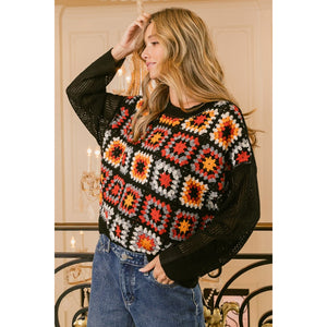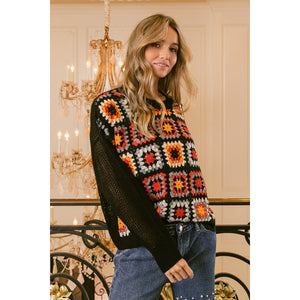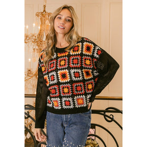This sweater top showcases a charming granny square design on the front for a retro-inspired look. The intricate crochet work adds a unique and cozy touch to the piece. Perfect for adding a vintage flair to your outfit and standing out from the crowd. The sweater top is versatile and can be dressed up with a skirt or dressed down with jeans for a casual vibe. A stylish and trendy choice for layering during the colder months or for creating a boho-chic ensemble. A fun and eye-catching addition to your wardrobe for a playful and eclectic style.