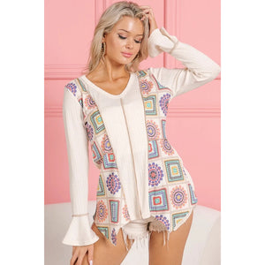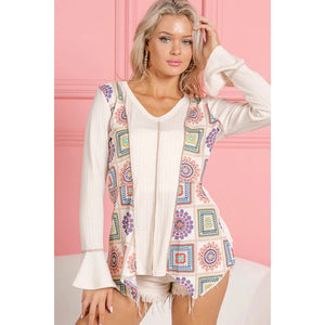 BiBi Granny Square Print Contrast Annie Rib V Neck Top