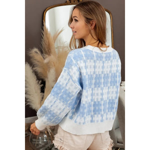Introducing the trendy Hashtag Grid Textured V-Neck Sweater Top - a perfect addition to your stylish wardrobe this season. This top features a unique grid pattern that adds texture and interest to your look. The V-neck design is flattering and versatile, making it easy to dress up or down for any occasion. Stay chic and cozy with this must-have sweater top!