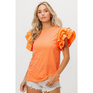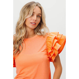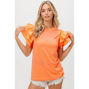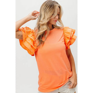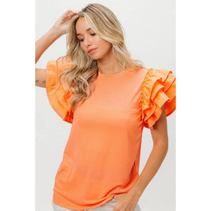 The Knit Top with Woven Ruffle Tiered Sleeves is a stylish and feminine piece that combines a cozy knit fabric with delicate woven ruffle sleeves in tiered layers. The knit top offers comfort and versatility, while the ruffle sleeves add a touch of elegance and charm. This combination creates a chic and eye-catching look that is perfect for various occasions. Pair this top with jeans for a casual yet sophisticated outfit, or with a skirt for a more dressed-up ensemble that highlights the beautiful sleeve detail.