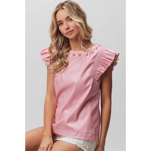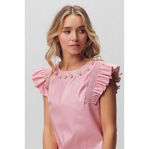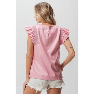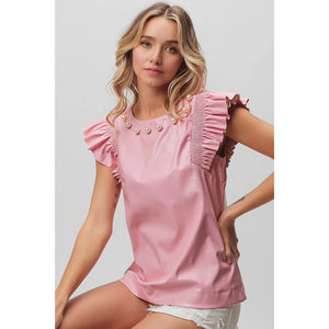 The Leather Smocked Ruffled Top is a stylish and edgy piece that combines elements of leather, smocking, and ruffles. The leather material adds a touch of sophistication and a hint of attitude to the top. The smocked detailing offers a fitted and textured look, while the ruffles bring a feminine and trendy touch to the overall design. This top is a versatile and statement-making choice that can be dressed up with trousers or a skirt for a chic ensemble, perfect for adding a bold and fashionable flair to your outfit.